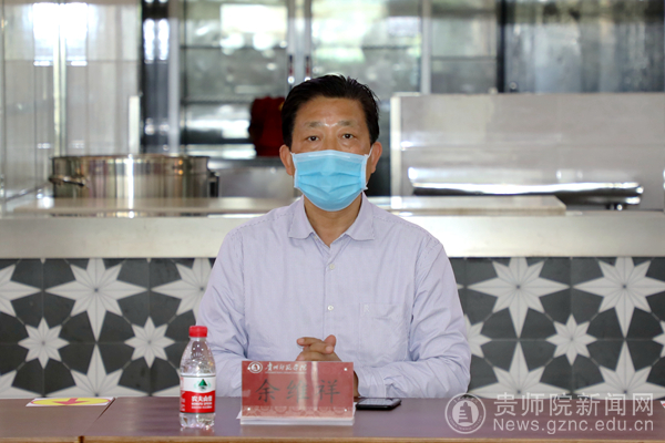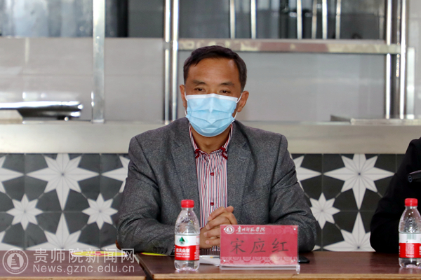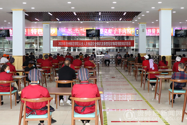 本网讯 2020年4月28日下午,为增强我校食堂从业人员业务水平及新型冠状病毒预防知识,增强食品卫生安全风险防范意识,杜绝食品卫生安全事故发生,在学校党委行政的统一部署及安排下,学校邀请了乌当区市场监督局高新分局局长宋应红、乌当区市场监督局食品科吴勇一行4人到我校感恩食府二食堂举办食堂从业人员食品卫生安全知识及新型冠状病毒预防知识培训。副校长余维祥出席培训会,学校食堂从业人员、扶贫超市工作人员110人参加本次会议。