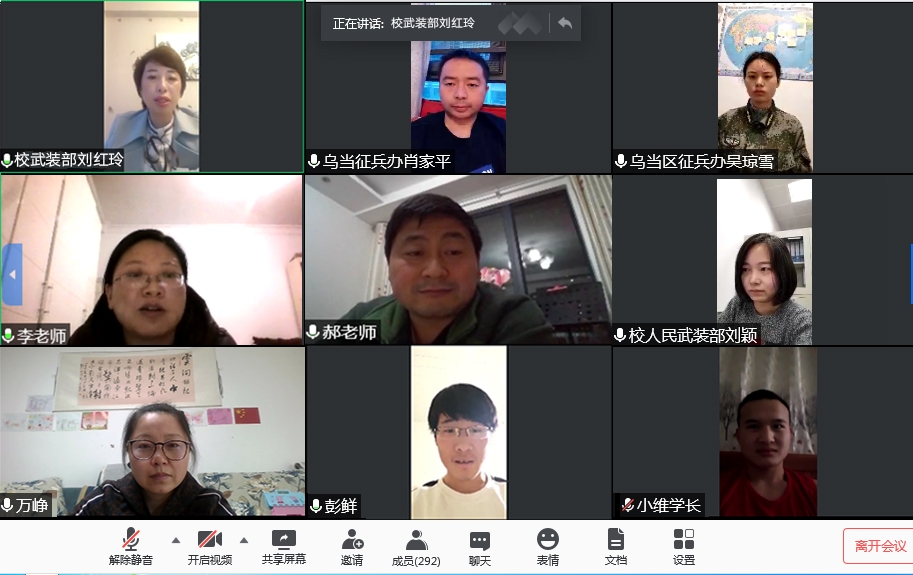 本网讯 4月29日,伟德国际1949官网2020年征兵工作云端宣讲咨询会顺利举行。由于当前处于抗击疫情的特殊时期,根据学校2019年征兵工作总结表彰暨2020年征兵工作推进会议精神,学校人民武装部和乌当区人民武装部利用线上平台开展了此次宣讲咨询会。参加此次会议的有学校人民武装部征兵人员和乌当区人民武装部征兵人员,二级学院征兵工作老师代表以及近300名有参军意愿的同学。会议由学校人民武装部刘颖老师主持。