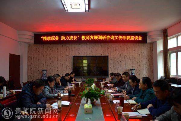 本网讯 为加强学校教师队伍的建设和发展,促进职能部门更好地服务教师专业及生涯发展。4月3日下午,教师工作处、人事处、教务处、科研处、质评办、计财处、后勤处、工会等部门负责人一行到文学与传媒学院开展“精准服务 助力成长”教师发展调研咨询服务活动,文传学院党委书记韦丹、副院长刘海涛及教师代表20余人参加了调研咨询服务活动。本次调研咨询服务活动由教师工作处处长谢笠主持。