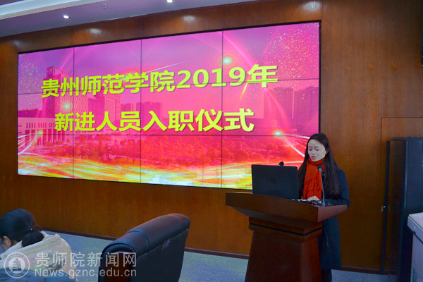 会上,入职仪式从四个环节依次进行。首先,人事处处长宋婷禹宣布2019年新进人员岗位分配情况,并对开展本次入职仪式的意义作了说明,入职仪式目的旨在激发新入职人员的职业荣誉感和自豪感,帮助新进人员尽快融入学校,热爱学校,树立主人翁精神,投身学校事业发展,适应新的工作、生活环境。接着,新入职人员代表赵翠华同志感谢学校对新进人员的关怀,从自身对教育、教师这份职业的深刻理解以及贵师院改制前后的发展历程和现状作了精彩的发言,表达了新进人员勤奋上进,追求理想,扎根贵师院,发展贵师院的决心。随后,新进人员上台集体进行《贵州教师誓词》宣誓;最后,校领导及二级单位负责人为2019年新进人员佩戴校徽并合影。