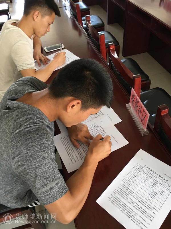 中午一点,学院辅导员、团委书记梁涛老师驱车来到金阳车站,将两个学生接上车,并当即将王刚书记捎来的往返车费600元分发给他们。而此时的王刚、刘讯并没有闲着,他们正在乌当街上给孩子们预订午餐。孩子们一到,吃完午餐,一起来到乌当区武装部,办理了相关手续,领取了新兵《预定通知书》。