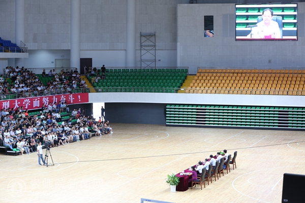 本网讯 8月18日下午,我校在体育馆隆重召开新学期全体教职工大会,安排部署新学期工作,全体在家校领导出席大会,副校长令狐荣锋主持大会。