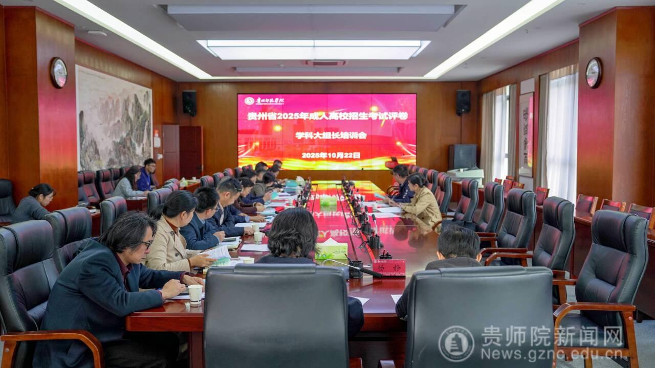本网讯 10月22日下午,贵州省2025年成人高校招生考试评卷试卷切割会暨学科大组长培训会在我校信息楼二楼会议室召开。省招生考试院党委委员、副院长黄克勇,伟德国际1949官网党委常委、副校长潘运出席会议,成人高校招生考试处副处长王丽萍、各评卷学科大组长、此次评卷技术公司项目负责人以及校评卷基地全体人员参加会议。会议由校评卷基地办公室主任、继续教育学院院长张婷主持。