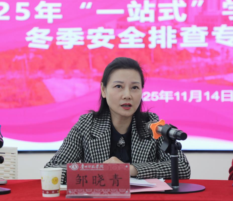 本网讯 为深入贯彻落实教育厅校园安全工作部署,筑牢冬季学生宿舍安全防线,11月14日,我校在“一站式”学生社区服务大厅召开2025年“一站式”学生社区公寓冬季安全排查专项行动部署会。校党委副书记邹晓青出席会议并讲话。