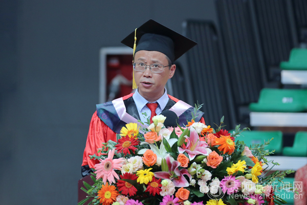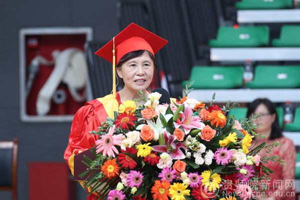 商学院院长程艳萍教授在发言中寄语广大毕业生,面对今天的中国和世界,广大学子必须超越昨天的自己;她希望同学们要有面对挫折的勇气,要有不畏风雨的底气,要保持同学们身上的书卷气。
