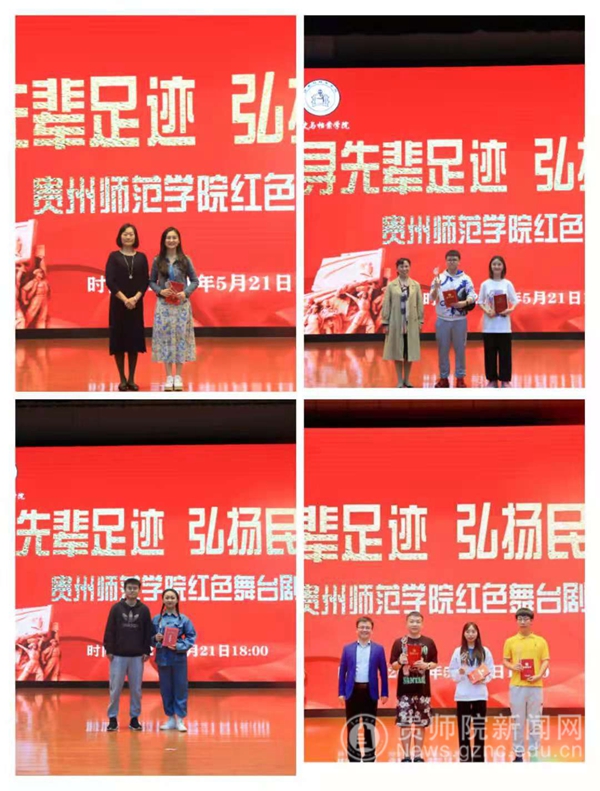 最后,经过现场评审打分,音乐与舞蹈学院选送的《红梨木》荣获一等奖;历史与档案学院选送的《抗战胜利》、音乐与舞蹈学院选送的《中华复兴路上的青春力量》荣获二等奖;文学与传媒学院选送的《红色河流》、美术与设计学院选送的《黎明》、历史与档案学院选送的《觉醒年代之陈延年》荣获三等奖;教育科学学院选送的《弘扬胡兰精神,传承红色基因》、商学院选送的《红色记忆》荣获优秀奖;音乐与舞蹈学院的《学四史,行四史,红色基因育新人》荣获最佳表演奖。付巧、吴靖霞、梁瑞等分别为获奖剧组颁奖,并合影留恋。