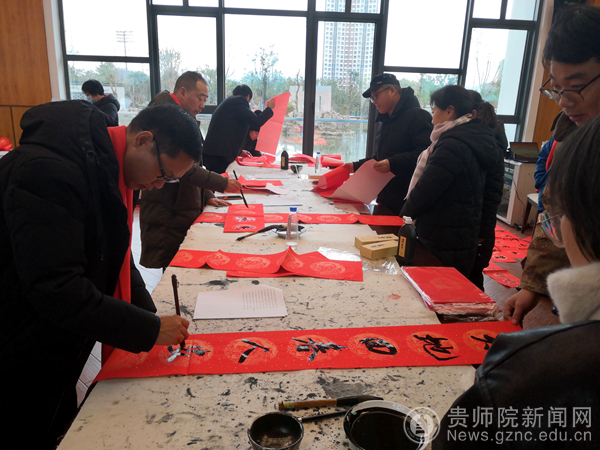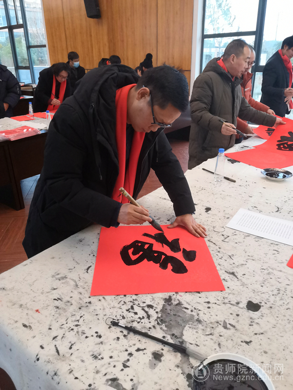 美术与设计学院基层工会组织书法教学团队石含洲、安毅、杨光学、白瑞荣、杨辉、宋廷位、谢安辉(文学与传媒学院)等老师,现场书写福字春联赠送全校教师及离退休教师。长桌排开,笔墨铺就,书法老师们手中的毛笔龙腾蛇舞,一幅幅饱含着浓浓年味、寓意吉祥的春联福字跃然纸上,春联一“出炉”,就被现场热情的老师们“抢走”了,场面十分火爆。