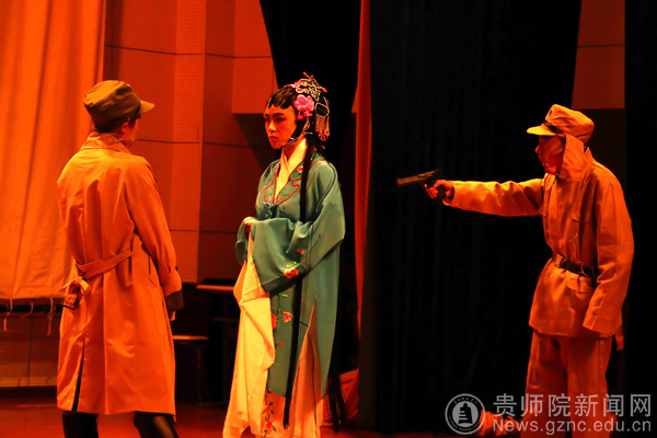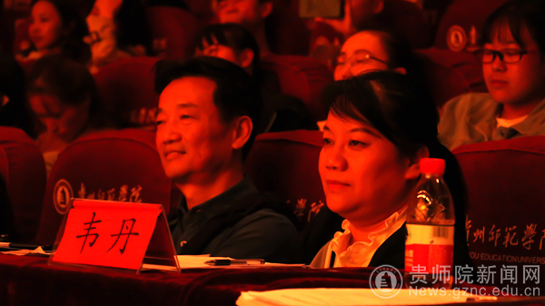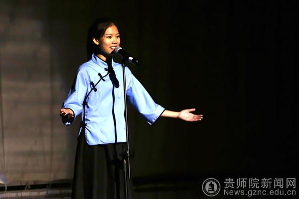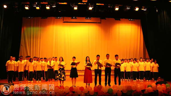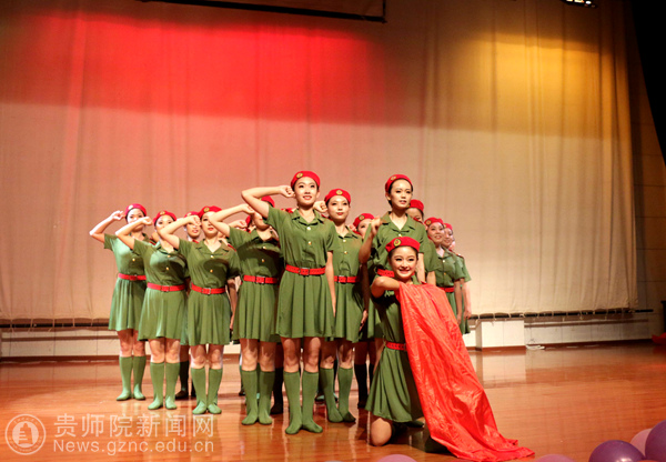 由教育科学学院带来的舞蹈《誓言》给人美的享受。同学们穿着绿色的军装,戴着红色的军帽,跳着优美的舞姿,这都是他们表达爱国情怀的方式。与此同时,由贵阳实验中学尹琪、孙彬等老师以及40名学生带来的集体朗诵《祖国啊,我亲爱的祖国》更是深入人心。他们时而以深沉地回顾着祖国曾经的艰难岁月,时而自豪、激昂地歌诵着祖国繁荣发展,跌宕起伏的朗诵令全体观众荡气回肠,向全体观众展示了他们对祖国深深的热爱,