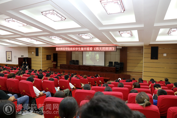本网讯 8月27日晚,我校师生代表400余人在道德讲堂集中观看中共贵州省委宣传部出品,中共遵义市委市政府、贵州广播电视台、贵州省文学艺术界联合会等联合出品的电视剧《伟大的转折》。