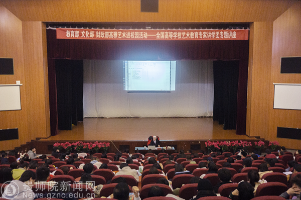 本网讯 11月21日下午,在我校逸夫楼演播厅举办 “高雅艺术进校园活动——全国高等学校艺术教育专家讲学团讲学活动”。大音乐舞蹈学院的师生们和学生艺术团参加了此次活动,本次讲学活动由校团委寇源老师主持。