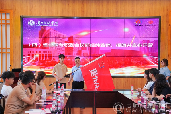 郭经纬致辞,对我校为此次交流活动的精心筹备表示感谢,从多方面介绍了贵州各地的风俗地貌和此次活动的行程安排,阐述了此次活动的重要意义与深远价值。他表示,贵州作为多民族聚居地,拥有丰富的历史文化底蕴和独特的自然景观,如今正以开放包容的姿态迎接八方宾客。致辞最后,郭经纬向台湾志愿者代表授旗,并郑重宣布活动正式开营。