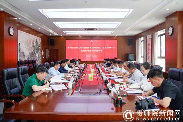 本网讯 6月4日,贵州农业职业学院党委书记邓庆生、院长苏跃一行到我校考察调研。我校党委书记石培新、校长韦维、党委副书记龙健陪同调研并参加座谈,会议由校长韦维主持。