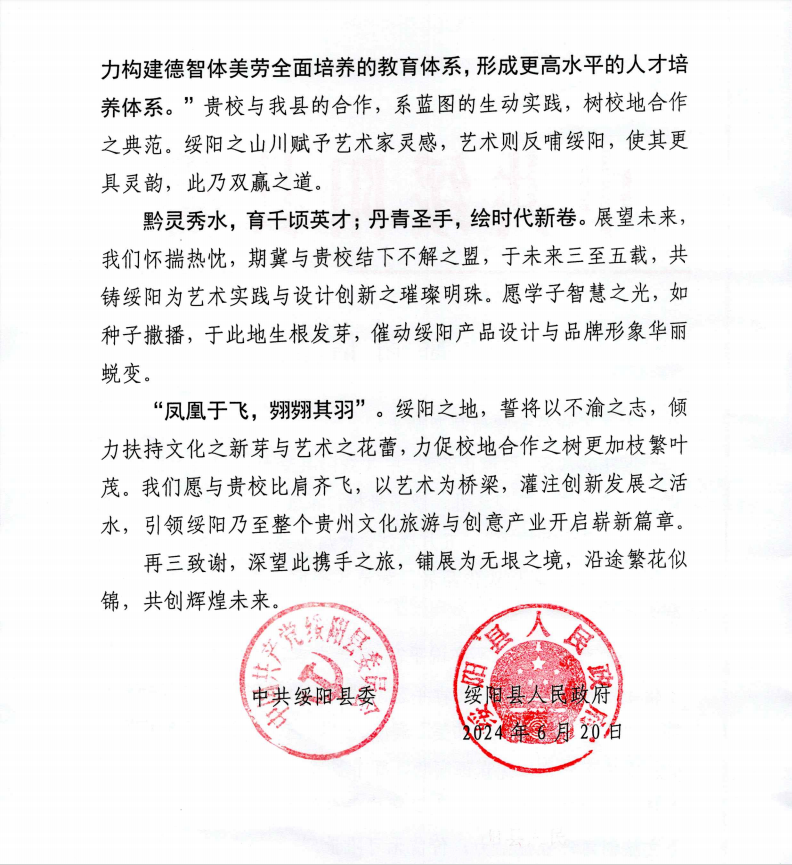 正是在这样的背景下,我校以美术与设计学院为牵头单位,与绥阳达成了校地合作协议,除绥阳成为美术与设计学院毕业创作实践基地的基础外,双方还将在人才培养、文化传承、文化旅游、创意产业等多个领域展开深度合作,共谋校地双方的繁荣发展。