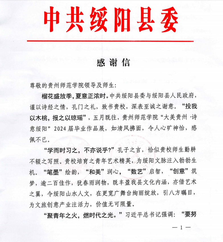 绥阳县委和县政府表示,我校的毕业设计展览不仅为他们提供了一次难得的学习和交流机会,更为当地的产业发展带来了新的思路和启示。他们希望,未来能够继续与我校保持紧密的合作关系,共同推动校地双方的持续发展。为此,他们专门写了感谢信和牌匾,牌匾上镌刻着“师院育英才,德艺双馨昭绥阳;地校共舞墨,创新实践谱华章”,深情表达了对我校在合作中所做贡献的感激之情。