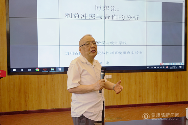 本网讯 2024年6月20日,学校邀请贵州大学俞建教授在印山书院二楼山骨讲堂为我校师生做了一场主题为“博弈论——利益冲突与合作的分析”的学术报告,数学与大数据学院师生、商学院部分师生聆听了报告,该学术报告由学校校长韦维教授主持。