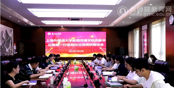 本网讯 7月22日上午,上海外国语大学新闻传播学院党委书记樊娟、办公室主任向丽华、副主任刘洁韵、教师李美、夏琪、辅导员郑涵一、万诗云、赵信智一行到我校调研交流,我校党委委员、副校长邹晓青出席会议,文学与传媒学院副院长陈欣、教学科研科科长秦雪影、系主任吕菁、学生党支部书记潘健强、教研室主任涂雨秋和教师骆雪参加会议。文学与传媒学院党委书记王军主持会议。