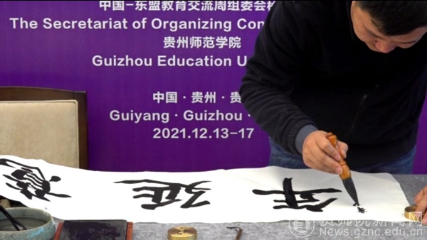当日下午,文学与传媒学院副教授谢安辉向学员们展示了中国国粹艺术——《翰墨飘香——中国书法艺术赏析》。他从书法的工具——笔墨纸砚讲起,接着介绍了几种经典书体,通过展示历代大家的传世作品,领着学员们共同赏析了中国书法艺术。而后,有备而来的谢安辉现场铺纸执笔,挥毫泼墨,为本场活动题写了五幅不同书体的墨宝。他表示,之所以选择书写“美意延年”这一成语,意在将美好的期盼送给各位学员。本阶段课程由我校对外交流合作处万艺林主持。
