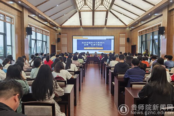 本网讯 6月1日下午学校特邀请贵州省《国际中文教师证书》考试认证中心负责人喻婷、教师黄洁宇到我校做题为《西班牙国际中文教育的发展、机遇与就业》的讲座。讲座由对外交流合作处处长张瑶主持,我校文传学院、外国语学院、教科院、数大学院、历档学院、双创学院、物电学院百余名师生聆听了讲座。
