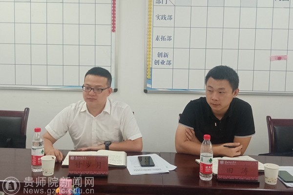 本网讯 7月14日下午,共青团铜仁市委挂职副书记,共青团印江县委书记甘岁月,共青团印江县委副书记田涛两人到我校进行交流学习访问,双方就团委建设工作在致远楼103会议室进行了座谈,我校团委副书记罗荣、陆轴、张源,活动部部长寇源,社会实践部部长张维域,校团委宣传部林红梅参加了座谈会。座谈会由我校团委副书记罗荣主持。