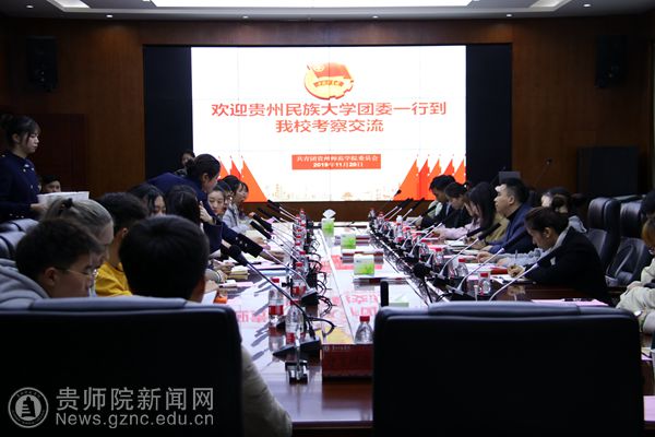 本网讯 11月20日,应我校邀请,贵州民族大学团委副书记胡斌、李建玲,办公室负责人吴丹,宣传部负责人溥丽华及各组织学生干部一行34人到我校开展访问交流。交流座谈会议在我校信息楼二楼会议室举行,由我校团委副书记罗荣主持,活动部部长寇源,社会实践部部长张维域,创新创业部负责人路尚明,办公室负责人黄逸,宣传部负责人耿召及各组织学生干部共39人参加此次会议。