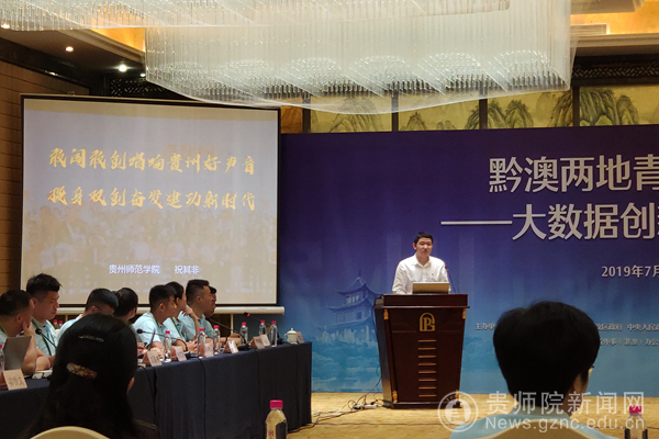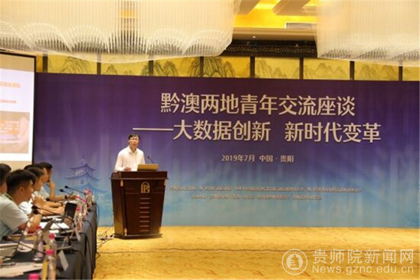 本网讯 7月15日上午,“新时代同心行”华西地区(贵州省)学习参访团黔澳两地青年交流座谈会在贵阳举行。双方以“大数据创新·新时代变革”为主题,分享、探讨两地在大数据等方面取得的成果和发展经验,我校双创团队代表祝其非作为贵州省学生代表上台发言。