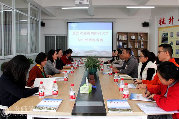 本网讯 11月16日,由贵州医科大学学工部副部长李宗梅,学工部思政科李雪萍,辅导员李丹、陈卫娅、彭丹、王瑞等组成的考察团到我校丽琼工作室参观交流。我校学工部部长薛璞,丽琼工作室成员热情接待了来访的考察团。