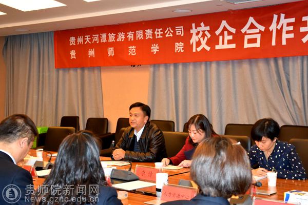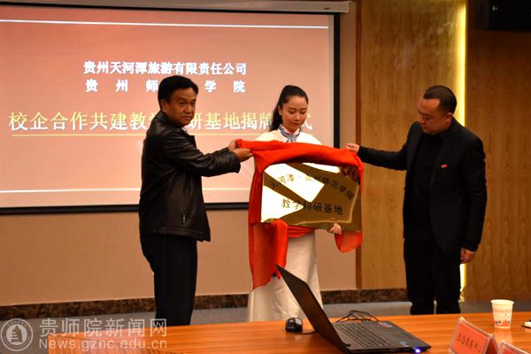 本网讯 11月2日,伟德国际1949官网地理与旅游学院院长李乐京教授、学院李倩副教授、罗清云老师、费雄老师一行四人赴天河潭景区参加“伟德国际1949官网与贵州天河潭旅游有限责任公司共建校企合作基地”揭牌仪式,并洽谈校企合作相关事宜。天河潭旅游有限责任公司的王兼总经理、马骏驰副总经理、人事经理罗小静及其相关部门负责人出席了揭牌仪式。
