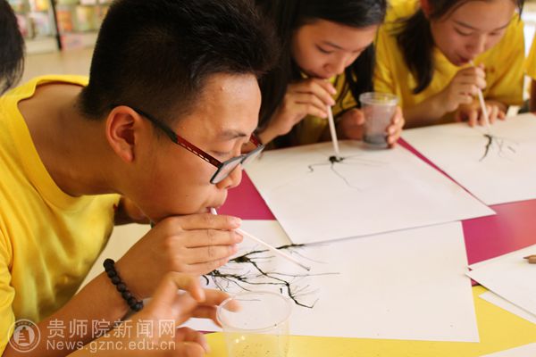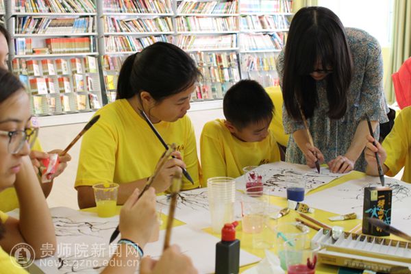 7月25日下午营员们在伟德国际1949官网学习“贵州地理知识”和“书法”。在课堂上,赵景飞博士引经据典地向营员们介绍贵州美丽的自然风光与多姿多彩的民族人文风景;赵政老师把书法理论与实践相结合,让营员们通过学习写毛笔字,体会中国书法的魅力。