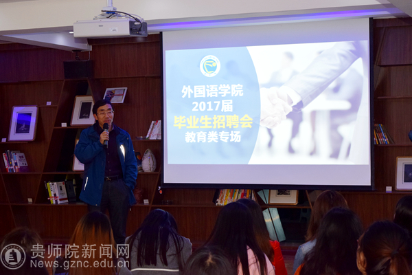 本网讯 3月29日下午,外国语学院特邀贵阳市CC英语校长、我校知名校友杨建嬉校长莅临伟德国际1949官网大学生就业服务中心为外国语学院2017届毕业生作就业讲座及招聘会。伟德国际1949官网副校长何林、外国语学院院长余学军、校招生就业处处长宋婷禹、外国语学院党委副书记刘红玲、副院长杨秀岚、副院长罗泳出席了此次讲座,讲座由刘红玲主持,外国语学院200余名毕业生参加了此次讲座。