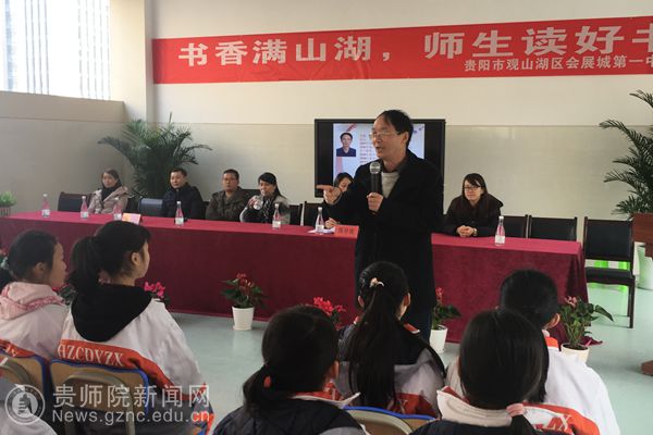 本网讯 为了进一步强化师范类专业的教师教育特色和优势,深入了解中小学教育实际和教改现状,文学院加强与基础教学单位的交流与合作。2月28日下午会展一中举办了“书香满山湖、师生读好书”系列活动之“作家进校园”活动。参加此次活动有文学院党委书记韦丹、院长吴俊、教师杨波、杨兴萍、詹峰;同时,文学院还邀请了贵阳市作家协会主席肖江虹参加活动。
