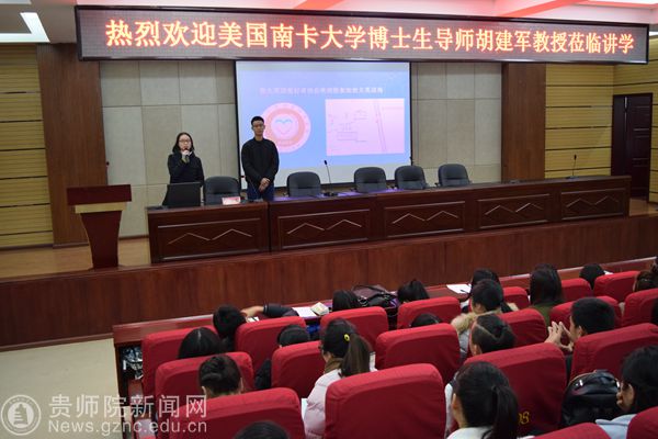 本网讯 12月16日下午,美国南卡大学的博士生导师、美国杰出青年自然科学基金获得者、南加州大学生物信息博士后、贵州大学机械学院访问教授、贵州大学英语角倡导者胡建军教授携贵州大学英语爱好者协会两位负责人同学应外国语学院繁星外语社的盛情邀请,在文韬苑道德讲堂举办了“共享、创新与英语角”专题学术讲座。讲座吸引了繁星外语社和其他学院的上百名同学前来聆听,繁星外语社指导老师卢静担任讲座主持。