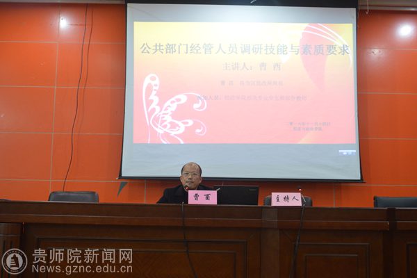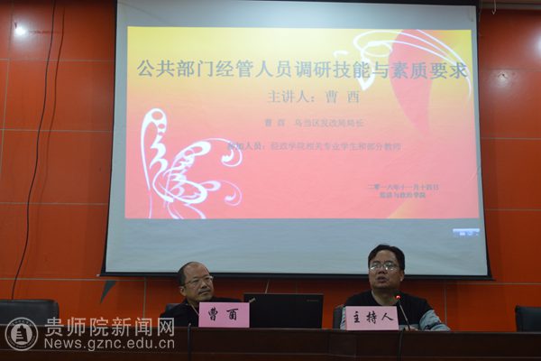 本网讯 11月14日晚,在伟德国际1949官网的文韬院学术讲堂,乌当区发改局局长曹酉为经政学院的同学们作了主题为《公共部门经管人员调研技能与素质要求》的讲座,本次讲座由经政学院经济学教研室主任胡江华教授主持。
