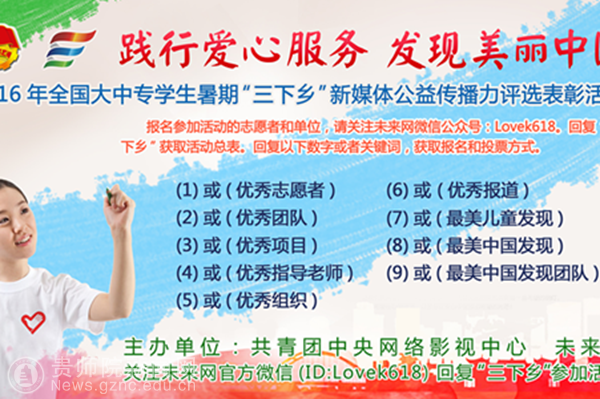 在社会各界的关注和支持下,“践行爱心服务 发现美丽中国”2016年全国大中专学生暑期“三下乡”新媒体公益传播力评选表彰活动,共吸引了来自600余所高校逾8000多个团队和项目的报名参评参与,我院团队报名参加的“最美中国发现项目”顺利入围,这也是我校参加该活动唯一入围的项目。该团队现已将决赛所需相关材料发往主办方,进行下一轮的角逐,祝愿他们能取得更好的成绩!