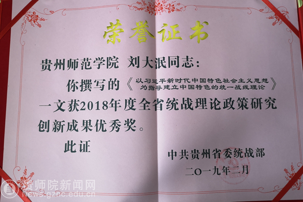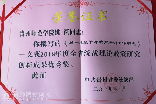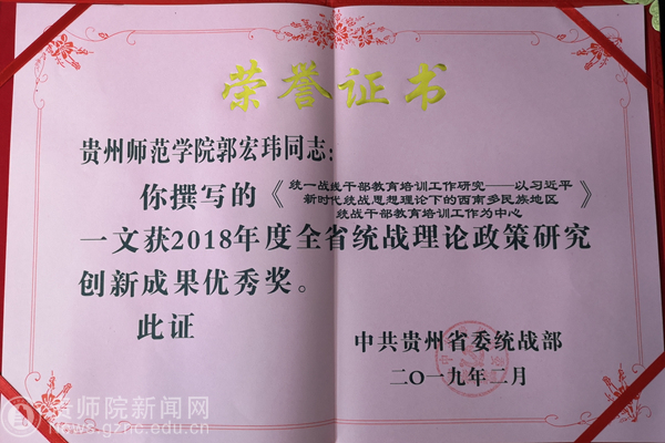 在2018年全省统战政策理论研究工作中,我校党委统战部荣获统战理论政策研究创新成果组织奖。同时,我校刘大泯同志撰写的《以习近平新时代中国特色社会主义思想为指导建立中国特色的统一战线理论》、姚篮同志撰写的《统一战线干部教育培训工作研究》、郭宏玮同志撰写的《统一战线干部教育培训工作研究——以习近平新时代统战思想理论下的西南多民族地区统战干部教育培训工作为中心》获统战理论政策研究创新成果优秀奖。