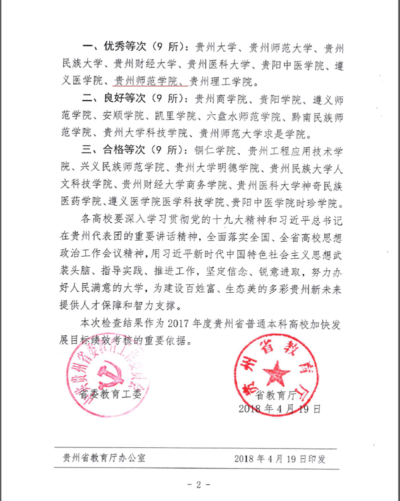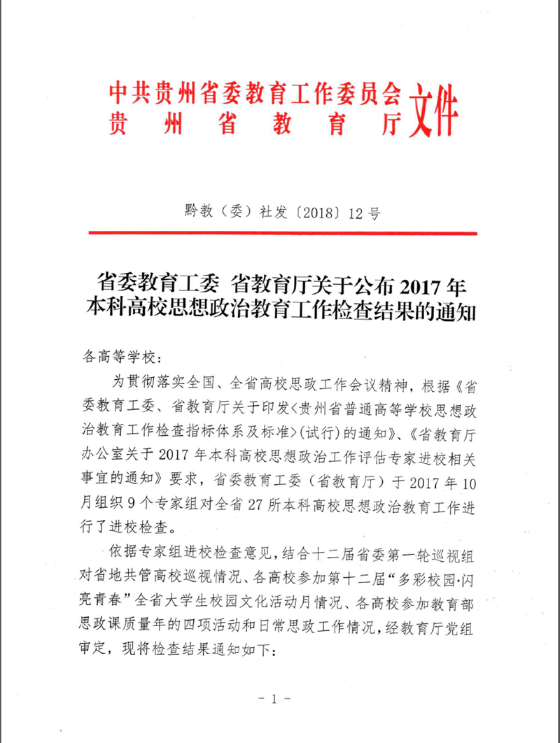 本网讯 近日,省委教育工委、省教育厅公布了全省2017年本科高校思想政治教育工作检查结果,我校以优异的成绩获得优秀等次,连续两届成为省委教育工委、省教育厅思政评估优秀学校。