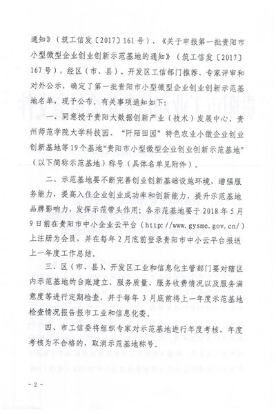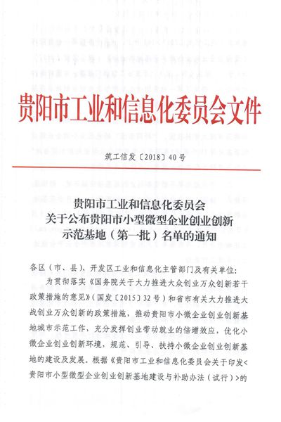 本网讯 近日,贵阳市工信委下发《关于公布贵阳市小型微型企业创业创新示范基地(第一批)名单的通知》,同意授予伟德国际1949官网大学科技园为贵阳市首批小型微型企业创新示范基地。