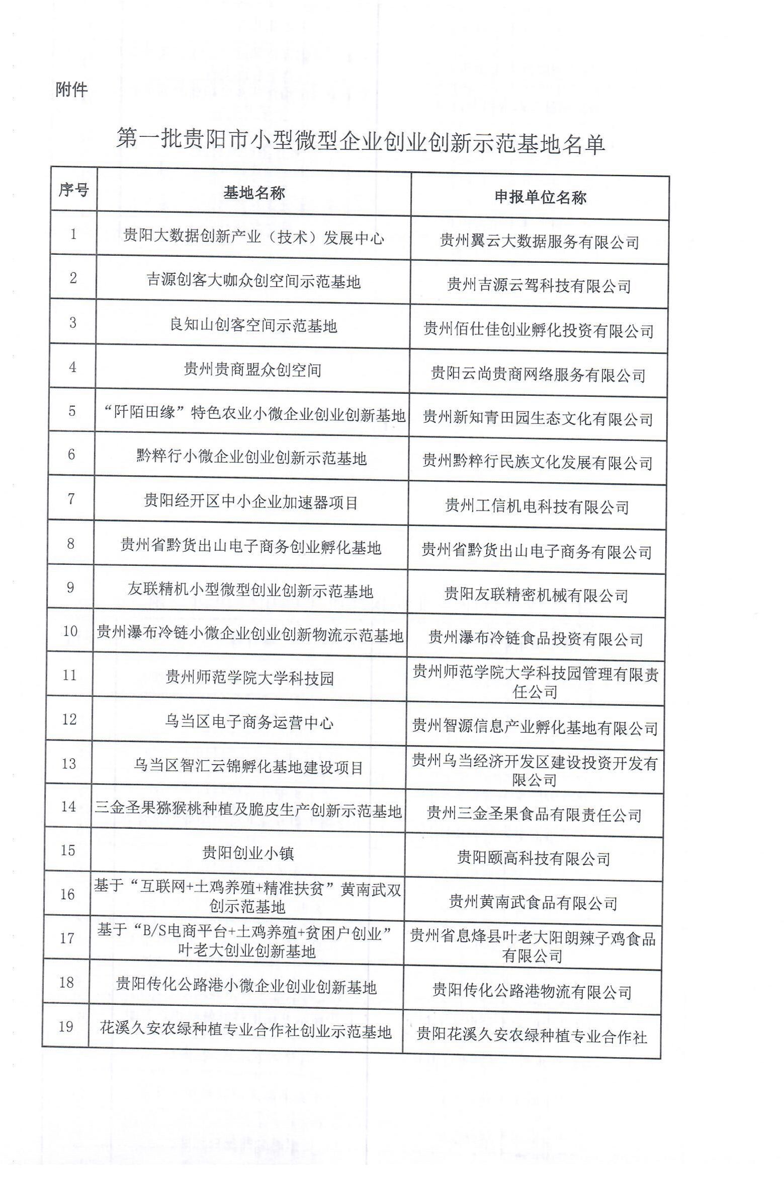 第一批贵阳市小型微型企业创业创新示范基地名单