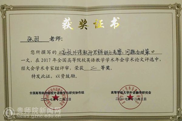 本网讯 2017年外研社杯高校英语教学之星大赛全国总决赛于12月6-8日在北京落下帷幕,我校外国语学院大外部张羽老师以全国复赛(成都选区)第一的身份晋级并荣登全国季军宝座。贵州省外语学会会长、外国语学院院长余学军教授担任张羽老师的指导专家。这是我省高校外语教师参加这一权威赛事以来的最好成绩。