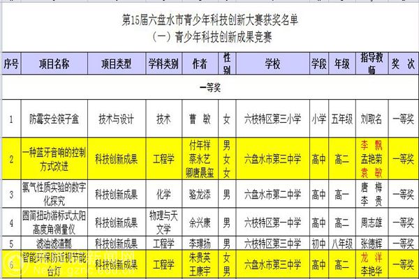 最终,我校创客教育实习生指导的四支参赛队伍,分别获青少年科技创新成果竞赛市一等奖2项、青少年科技创意比赛市一等奖2项。其中,作品“一种蓝牙音响的控制方式改进 ”(学生:付年祥、蔡永艺、卿唐晨玺,指导教师:李飘)和“智能环保防近视节能台灯”(学生:朱桂英、王康宇,指导教师:龙洋)获青少年科技创新成果竞赛市一等奖;作品“意念浏览器”(学生:卿唐晨玺,指导教师:李飘)和“智能衣柜”(学生:胡涵,指导教师:袁敏)获青少年科技创意比赛市一等奖。大赛主办单位六盘水市科学技术协会在其官网上公布了获奖名单。