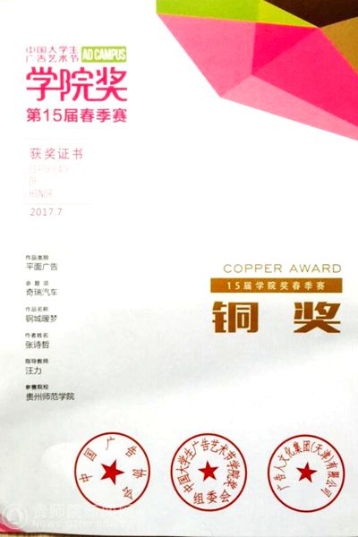 本网讯 在刚刚圆满落下帷幕的第十五届“中国大学生广告艺术节”春季赛中,我校设计学院16级数字媒体艺术专业学生获得“铜奖一项,佳作奖三项”、汪力老师获得“杰出指导教师”奖。