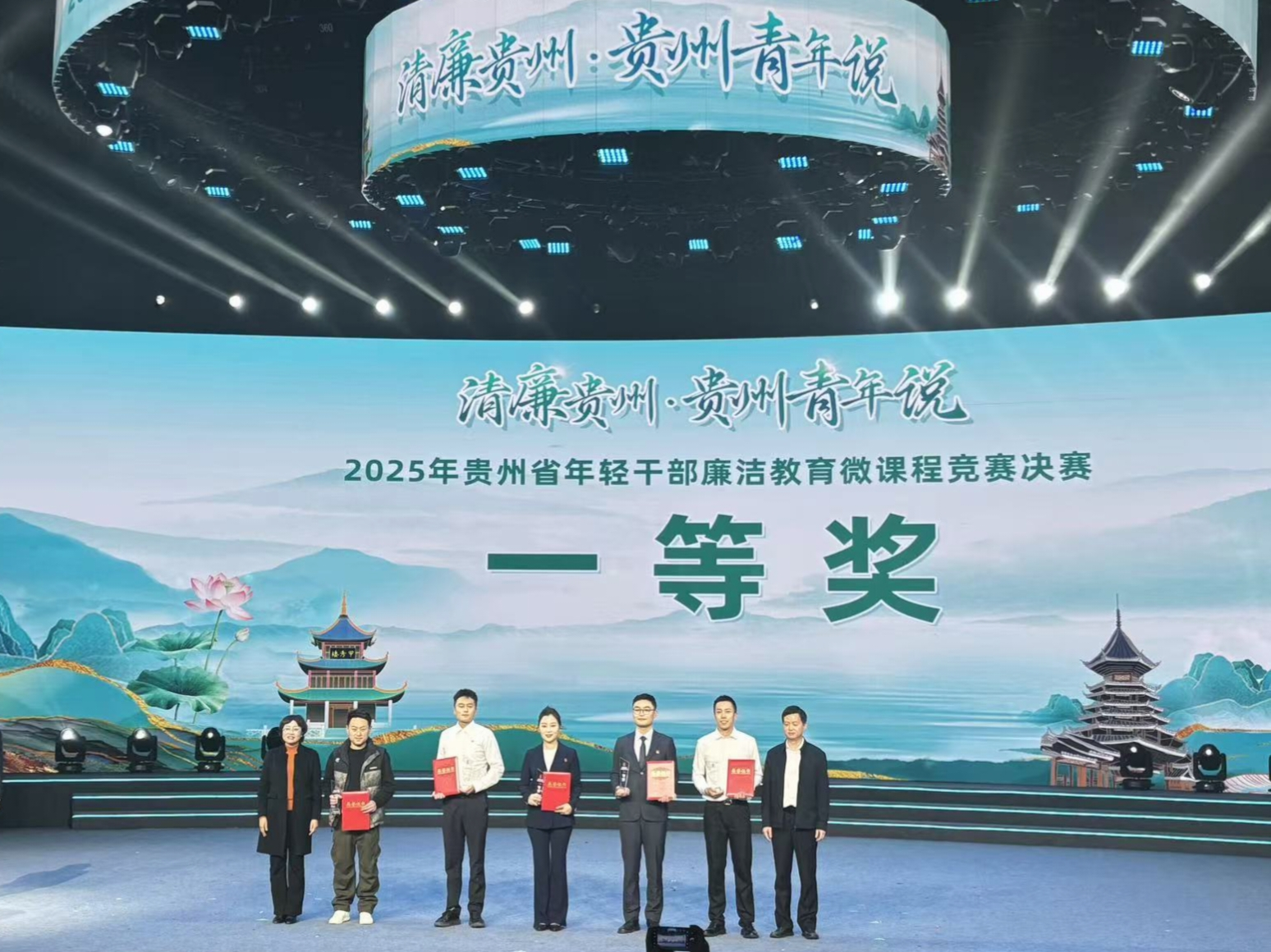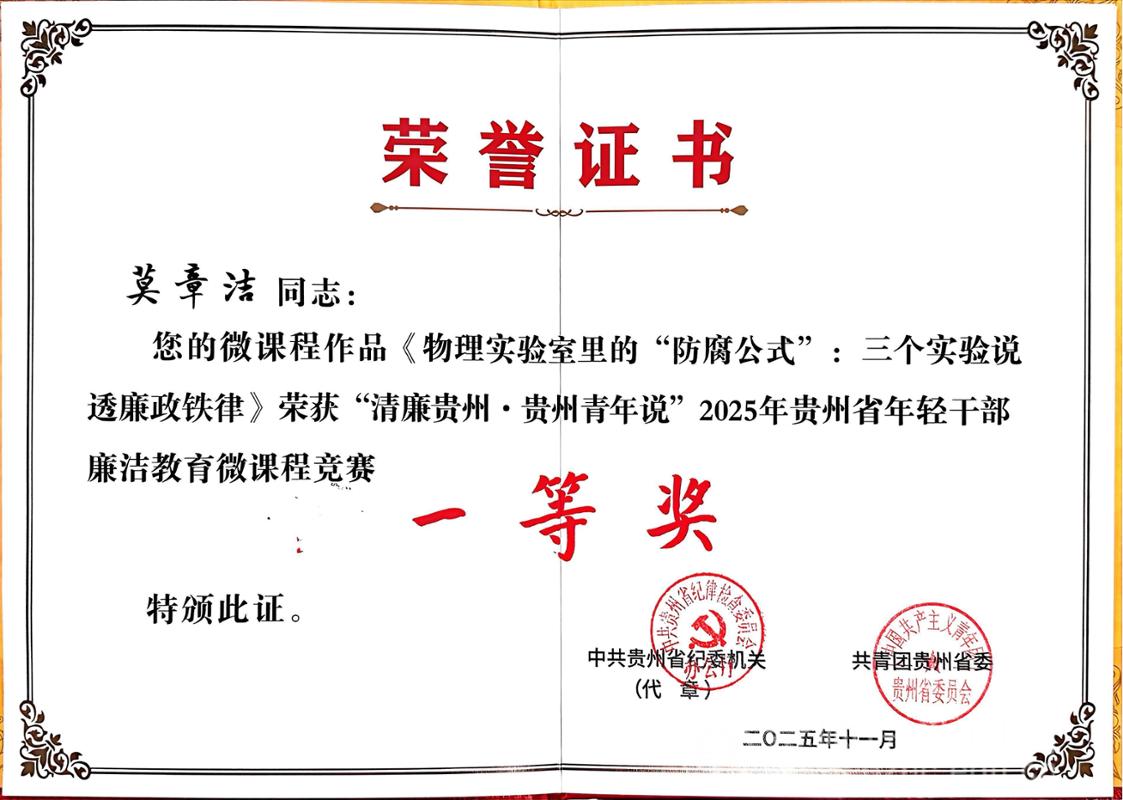 本网讯 11月18日,“清廉贵州·贵州青年说:学规定·守纪律·正作风”2025年贵州省年轻干部廉洁教育微课程竞赛决赛在贵州广播电视台演播厅圆满落幕。我校选送的作品《物理实验室里的“防腐公式”:三个实验说透廉政铁律》表现优异,荣获一等奖!