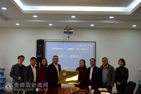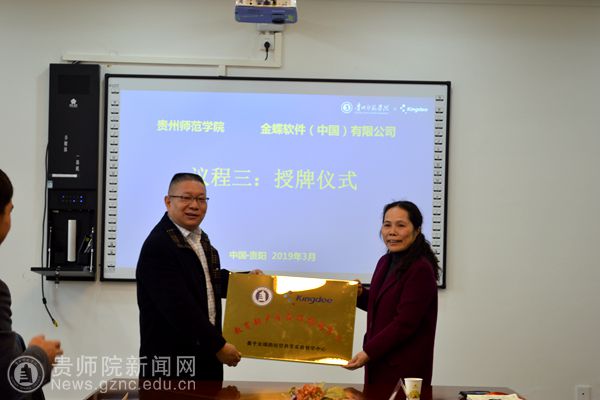 本网讯 3月22日,我校与金蝶软件(中国)有限公司在商学院会议室举行教育部产学合作协同育人项目的启动授牌仪式。我校副校长熊世桓教授、商学院院长程艳萍教授、商学院党委书记薛璞、商学院副院长黄丹副教授、金蝶精一信息技术服务有限公司副总裁乐志军、金蝶精一信息技术服务有限公司贵州省区总监莫才龙、贵州云上智信科技有限公司总经理易昌波、商学院实验管理人员及教职工代表出席授牌仪式。仪式由程艳萍主持。