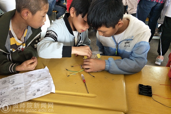 今天的工作内容为创客实践培训。首先,志愿者为孩子们播放了一些优秀创客作品的小视频如:钢琴八音盒、手机微信小游戏“跳一跳”开外挂和智能循迹小车等。这些新奇的优秀创客作品引起了孩子们的兴趣,充分调动了孩子们的积极性,引发了孩子们的求知欲,为接下来“智能循迹小车”的教学奠定了基础。接着,志愿们就智能循迹小车的循迹原理和最简单的电路图开始着手讲解,慢慢引入一些较抽象的相关概念。孩子们由初步接触陌生的开源硬件Arduino到熟练掌握与Arduino相关的知识,并能熟练运用Arduino Scratch图形化编程点亮一盏LED灯。孩子们越来越自信,兴趣也越来越浓。随后,志愿者们将循迹小车的构件根据讲解进度分批次发到孩子们手上,让孩子们了解这些构件的作用。有了前面的这些基础,孩子们开始根据志愿者演示的步骤组装小车。由于时间关系孩子们未能拿出自己的作品,回家时间就到了,志愿者便和孩子们一起相约明天的“循迹小车”比赛。
