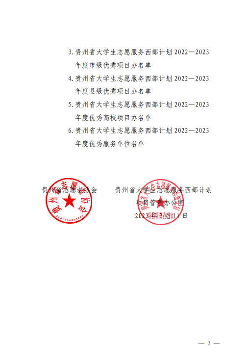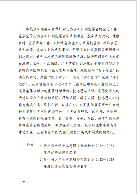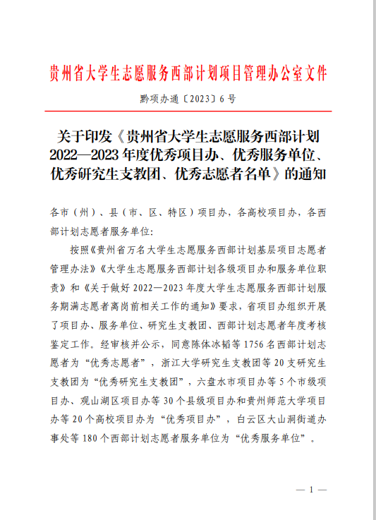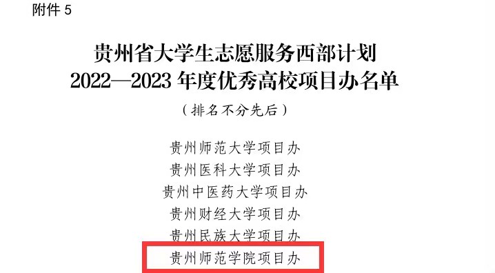 本网讯 近日,贵州省志愿者协会、贵州省大学生志愿服务西部计划项目管理办公室下发《贵州省大学生志愿服务西部计划2022—2023 年度优秀项目办、优秀服务单位、优秀研究生支教团、优秀志愿者名单》(黔项办通〔2023〕6 号),我校西部计划项目办被评为“贵州省大学生志愿服务西部计划2022—2023 年度优秀高校项目办”。