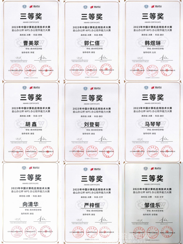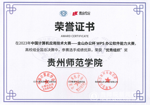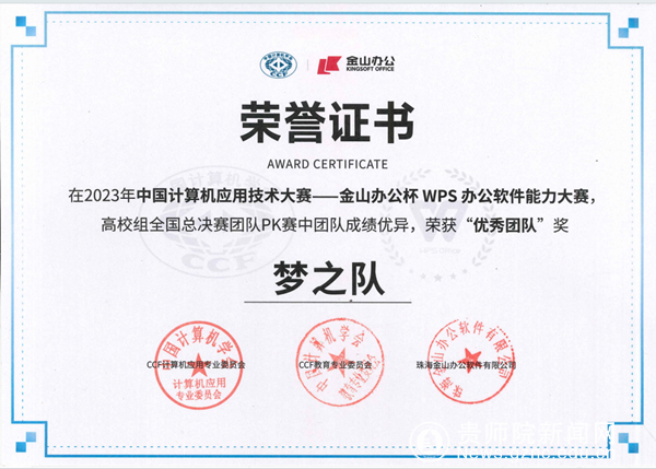 本网讯 近日,2023年度中国计算机应用技术大赛——金山办公杯WPS办公软件能力大赛(以下简称WPS大赛)总决赛在苏州CCF总部落下帷幕。我校参赛代表队“梦之队”突破重围,成功入围全国前十,进入团队PK赛,同时也是我省8支高校参赛队伍中唯一进入全国PK赛的团队,最终荣获全国优秀团队奖。团队9名同学获全国三等奖,四位指导老师获“优秀指导老师”称号,学校荣获优秀组织奖。
