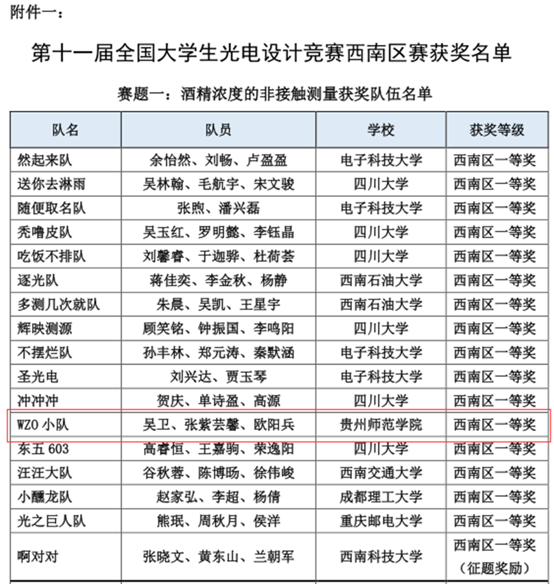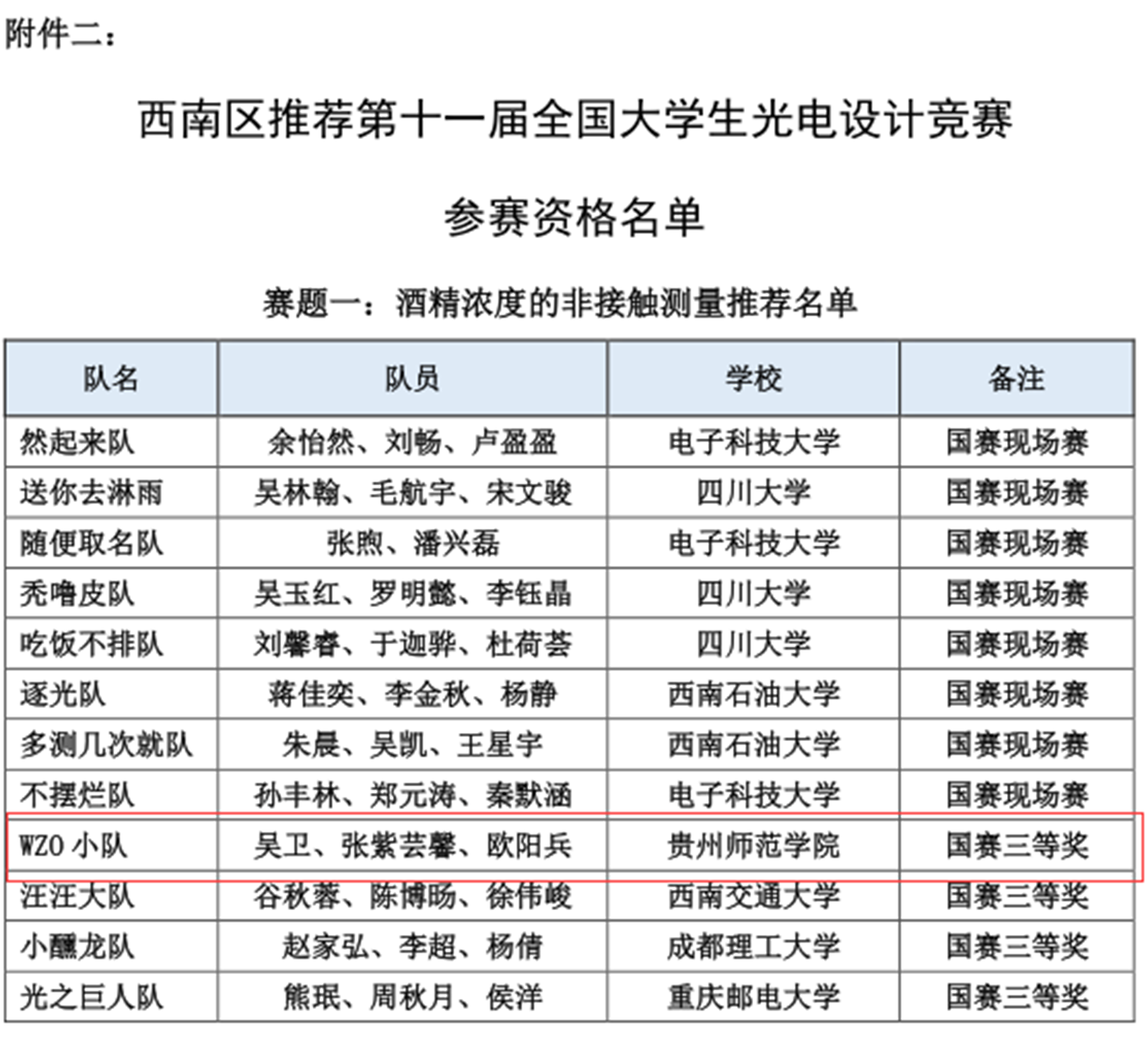 本网讯 第十一届全国大学生光电设计竞赛西南区赛于2023年8月12日至14日在电子科技大学成功举办,来自四川、重庆、贵州、云南、西藏的36所院校262支队伍近1310名师生报名参赛。本次竞赛分为两个赛题(赛题一:酒精浓度的非接触测量;赛题二:“迷宫寻宝”光电智能小车)。我校报名参赛酒精浓度非接触测量组与光电智能小车组共6支队伍,同学们在比赛中奋勇争先,赛出了风采。经过现场赛三轮的激烈比拼,由指导老师陈德良、杨月菊带领的由吴卫、张紫芸馨、欧阳兵组成的WZO小队(酒精浓度)荣获西南区赛一等奖拟推国赛资格,由指导老师莫章洁、陈德良带领的由张文龙、王春和冯燃燃组成的旺旺队(小车组)荣获西南区赛三等奖;陈德良、杨月菊获得优秀指导教师奖;伟德国际1949官网获得优秀组织奖。