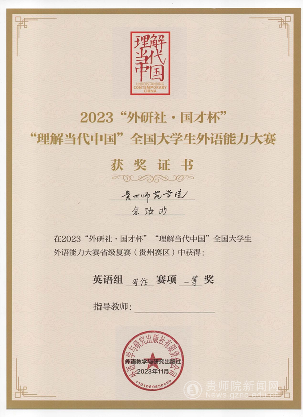本网讯 2023年11月4日至5日,2023年“外研社·国才杯”全国大学生外语能力大赛(写作、阅读、演讲、笔译、口译)贵州赛区决赛在贵州医科大学(宝山路校区)成功举办。我校学生在写作赛事中获一等奖1人,二等奖2人,三等奖1人,优秀奖1人;在阅读赛事中获二等奖1人,三等奖1人,优秀奖2人;在演讲赛事中获二等奖1人,三等奖1人,优秀奖1人;在笔译赛事中获优秀奖1人。