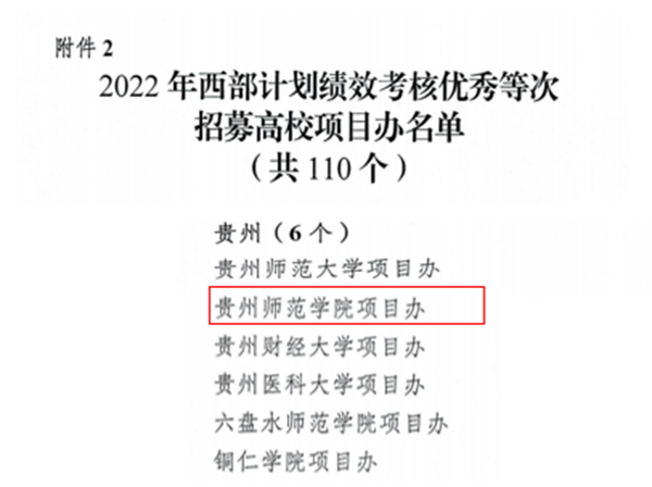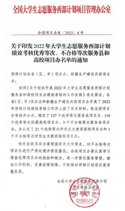 本网讯 近日,全国大学生志愿服务西部计划项目管理办公室发布《关于印发2022年大学生志愿服务西部计划绩效考核优秀等次、不合格等次服务县和高校项目办名单的通知》(〔2023〕4号)。我校荣获2022年全国西部计划“优秀高校项目办”称号。