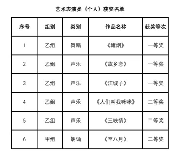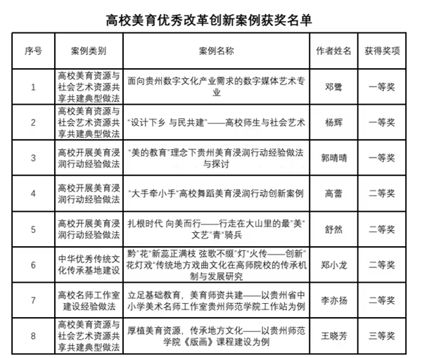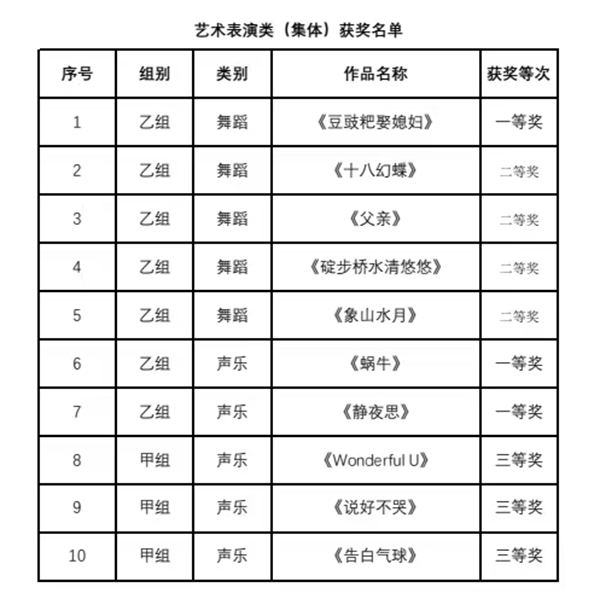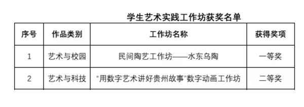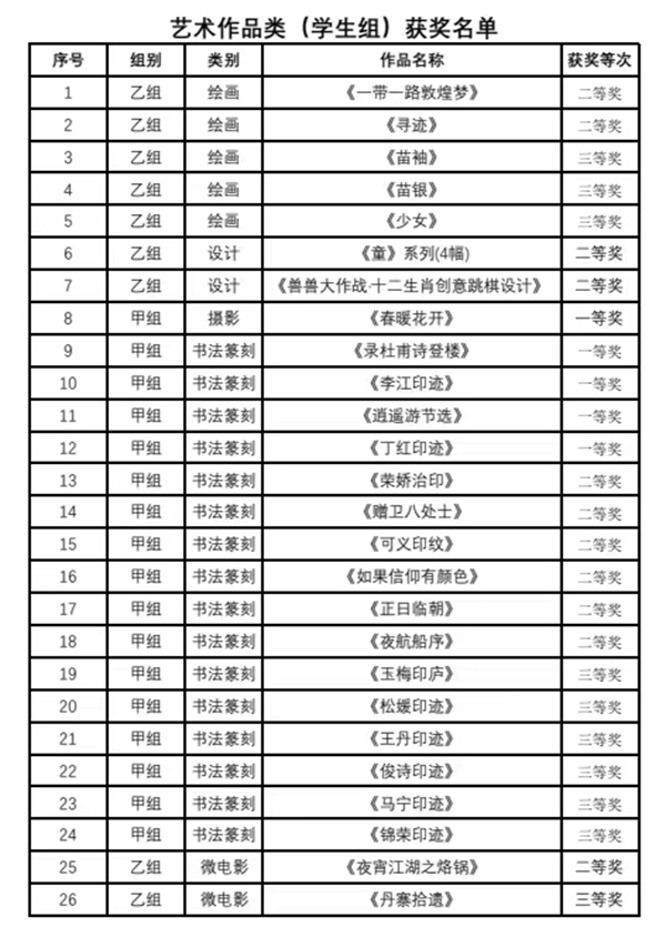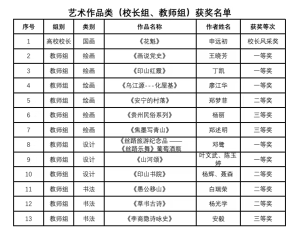 我校在全省竞赛中共获得三等奖以上奖项65项,其中艺术表演类(集体)奖项10项、艺术表演类(个人)项目6项、艺术作品(校长、教师)奖项13项、艺术作品(学生)奖项26项、艺术实践工作坊2项、高校美育优秀案例8项。其中一等奖20项、二等奖27项、三等奖17项。同时,我校荣获优秀组织奖。我校的部分作品将代表贵州省参加全国大学生艺术展演的竞赛,预祝我校作品在全国竞赛中取得好的成绩。