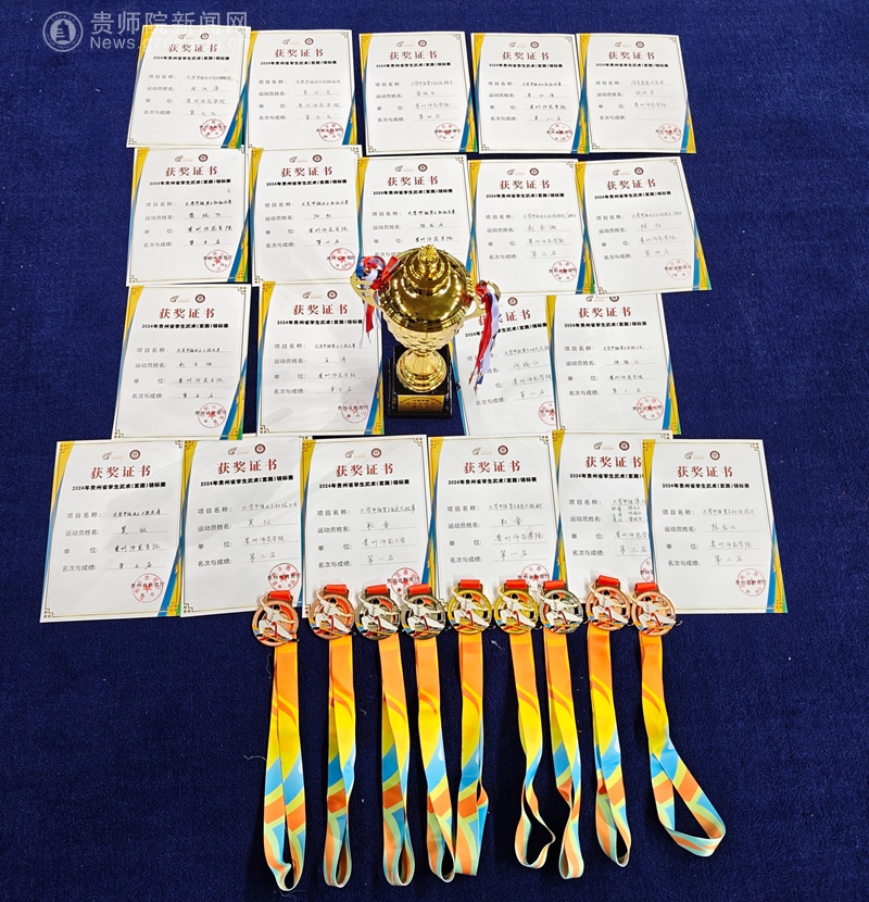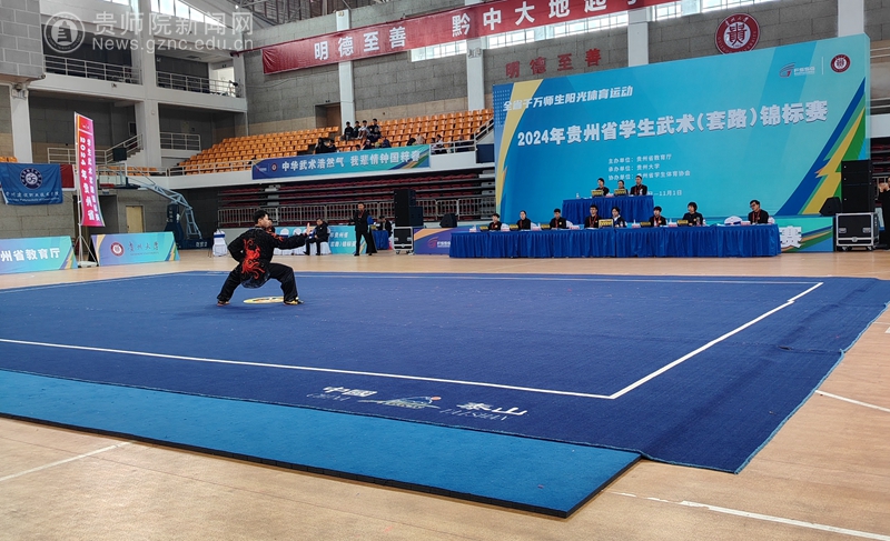 本网讯 2024年贵州省学生武术套路锦标赛于10月30日至11月1日在贵州大学东校区举行。由我校体育学院师生组成的武术代表队,在三天的激烈角逐中,以良好的精神风貌和过硬的技术水平,从12支高校队伍中脱颖而出,获得2金3银5铜等各类奖项21项,最后获高校组团体总分第三名。